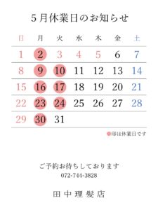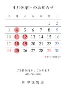 Tweet Share Hatena Pocket RSS feedly Pin it この記事のタイトルとURLをコピーする 毎度ありがとうございます。 2022年4月と5月の休業日についてお知らせいたします。 ※5月3日(火)~5日(木)は祝日ですが、学割対象日とさせていただきます。 当店は店主一人のため、接客中お電話に出ることができない場合がございます。 その際は、大変お手数おかけして申し訳ございませんが、再度お電話いただけますと幸いです。 それでは、ご予約お待ちしております。 Tweet Share Hatena Pocket RSS feedly Pin it この記事のタイトルとURLをコピーする 2022年3月・4月休業日のお知らせ 前の記事 2022年6月・7月休業日のお知らせ 次の記事