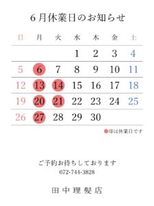 Tweet Share Hatena Pocket RSS feedly Pin it この記事のタイトルとURLをコピーする 毎度ありがとうございます。 2022年6月と7月の休業日についてお知らせいたします。 当店は店主一人のため、接客中お電話に出ることができない場合がございます。 その際は、大変お手数おかけして申し訳ございませんが、再度お電話いただけますと幸いです。 それでは、ご予約お待ちしております。 Tweet Share Hatena Pocket RSS feedly Pin it この記事のタイトルとURLをコピーする 2022年4月・5月休業日のお知らせ 前の記事 2022年7月・8月・9月休業日のお知らせ 次の記事
